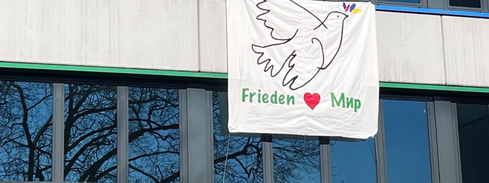 Seit Freitag (4. März 2022) ziert die Friedenstaube von Pablo Picasso den Neubau des Adolfinums mit dem Schriftzug "Frieden - Мир". Schülerinnen und Schüler der Einführungsphase habe diese gestaltet, um ein Zeichen der Solidarität mit den Menschen im Krieg zu setzen. Ein Detail ist dabei wichtig, die Taube soll Frieden für die Menschen in der Ukraine aber auch in Russland bringen.