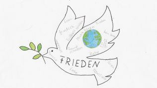 Darüber hinaus ist auf Initiative von Ulrike Krakow und der Fachschaft Religion in der Pausenhalle eine Box für Friedensgebete aufgestellt worden, in die man seine Ängste, Wünsche, Hoffnungen oder eben Gebete werfen kann. Gerahmt wird diese Box von Stellwänden, die im Religionsunterricht entstandene Friedenstauben zeigen. Eine Stellwand ist noch frei und bietet Platz für alle Schülerinnen und Schüler, die ebenfalls das Bedürfnis haben ihre Gedanken, Wünsche, Bilder zum Krieg oder Ähnliches zu veröffentlichen.