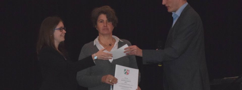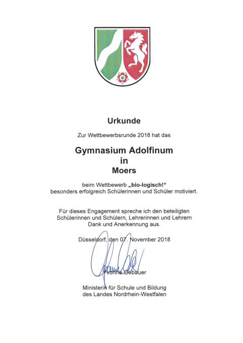 Seit Jahren nehmen Schülerinnen und Schüler des Adolfinum am renommierten "bio-logisch!"-Wettbewerb teil. Für dieses besondere Engagement - und nicht zuletzt für die zahlreichen qualitativ hochwertigen Wettbewerbsbeiträge - wurde die Fachschaft Biologie ausgezeichnet: Am 7. November 2018 nahmen die Fachvorsitzenden Katharina Adams und Dr. Evelyn Kleine den Preis in einer Feierstunde im Planetarium Bochum entgegen. Und natürlich haben auch am diesjährigen Wettbewerb - Thema "Alles klar!?" - viele Adolfiner teilgenommen.