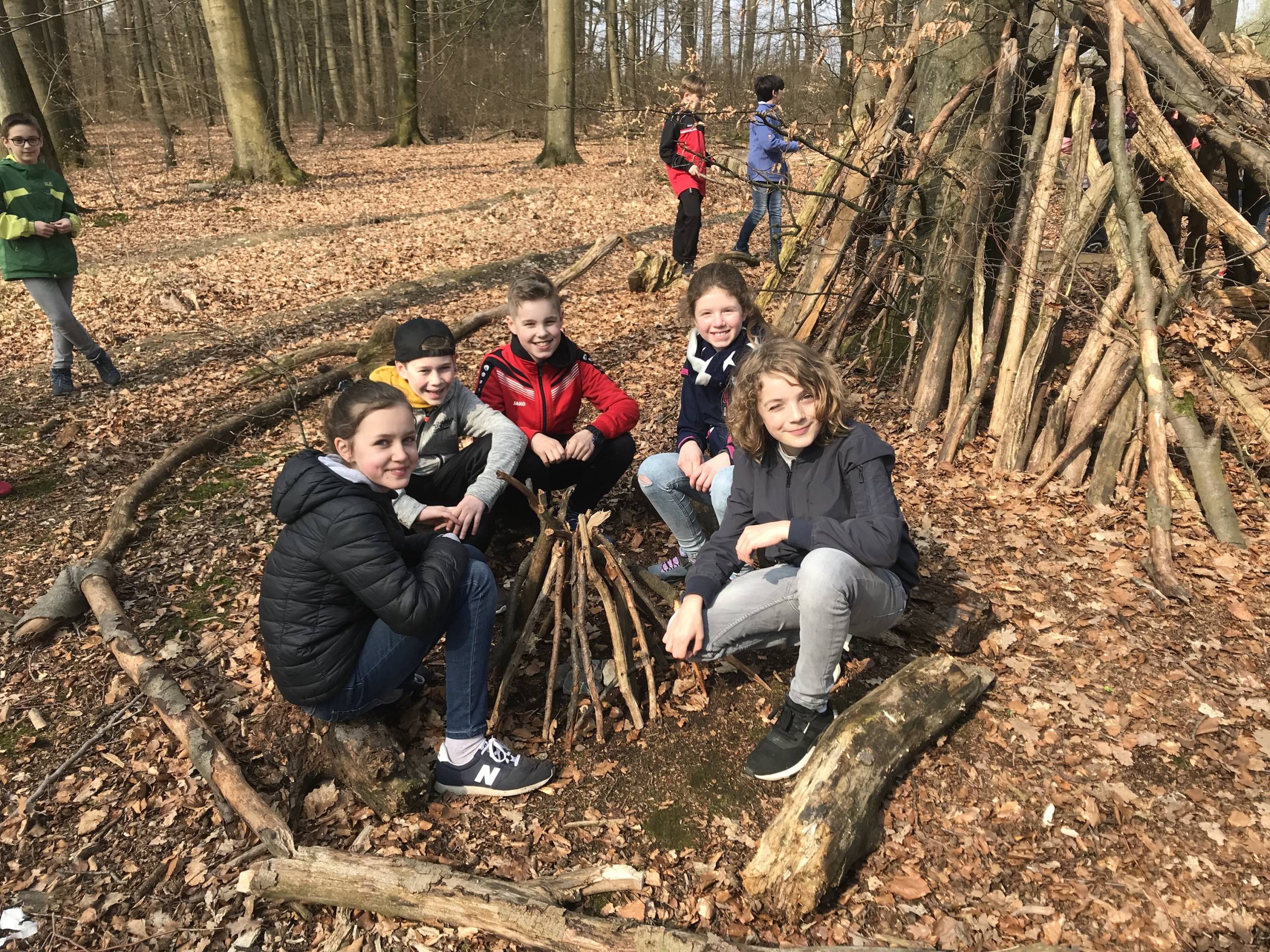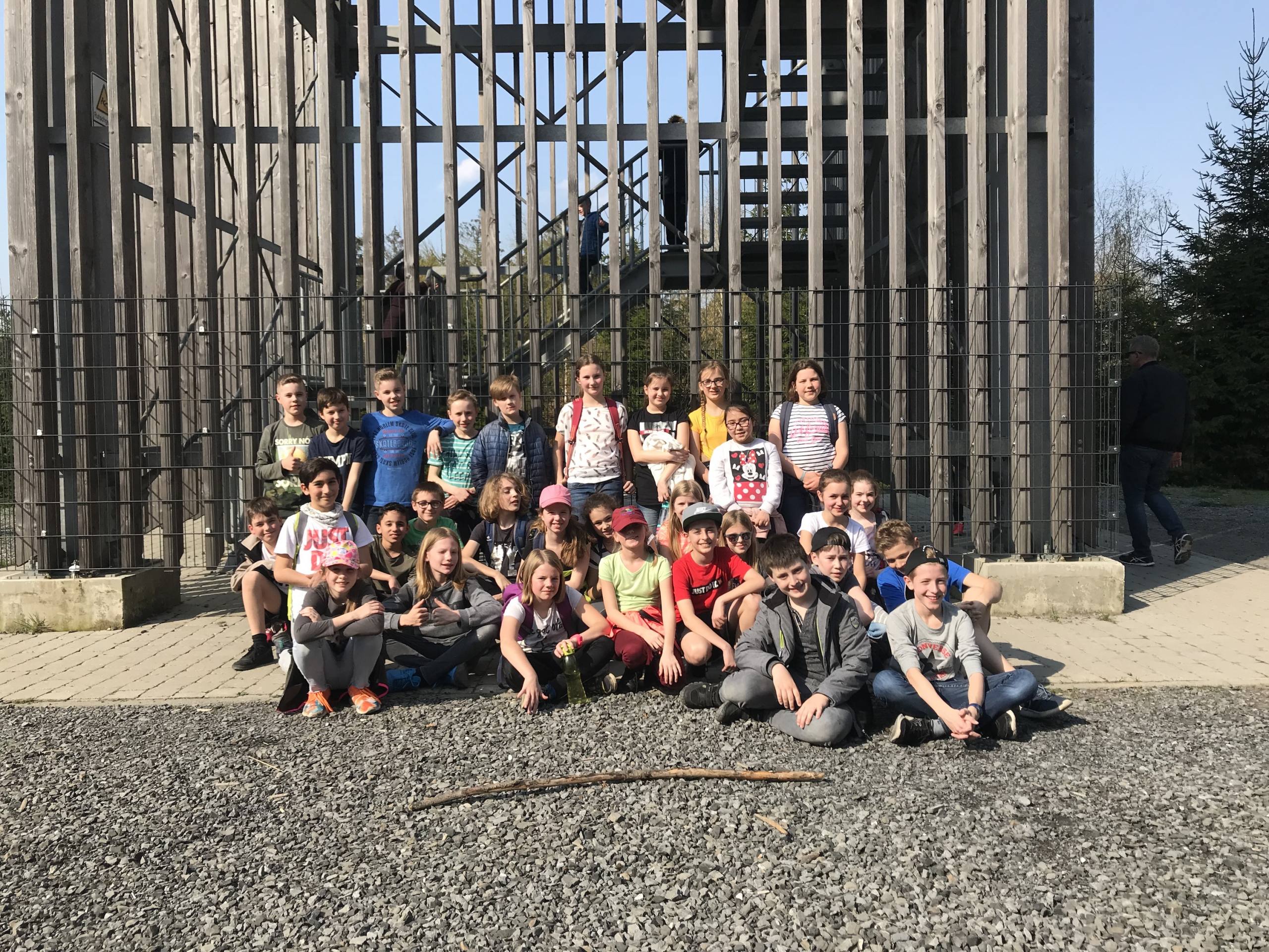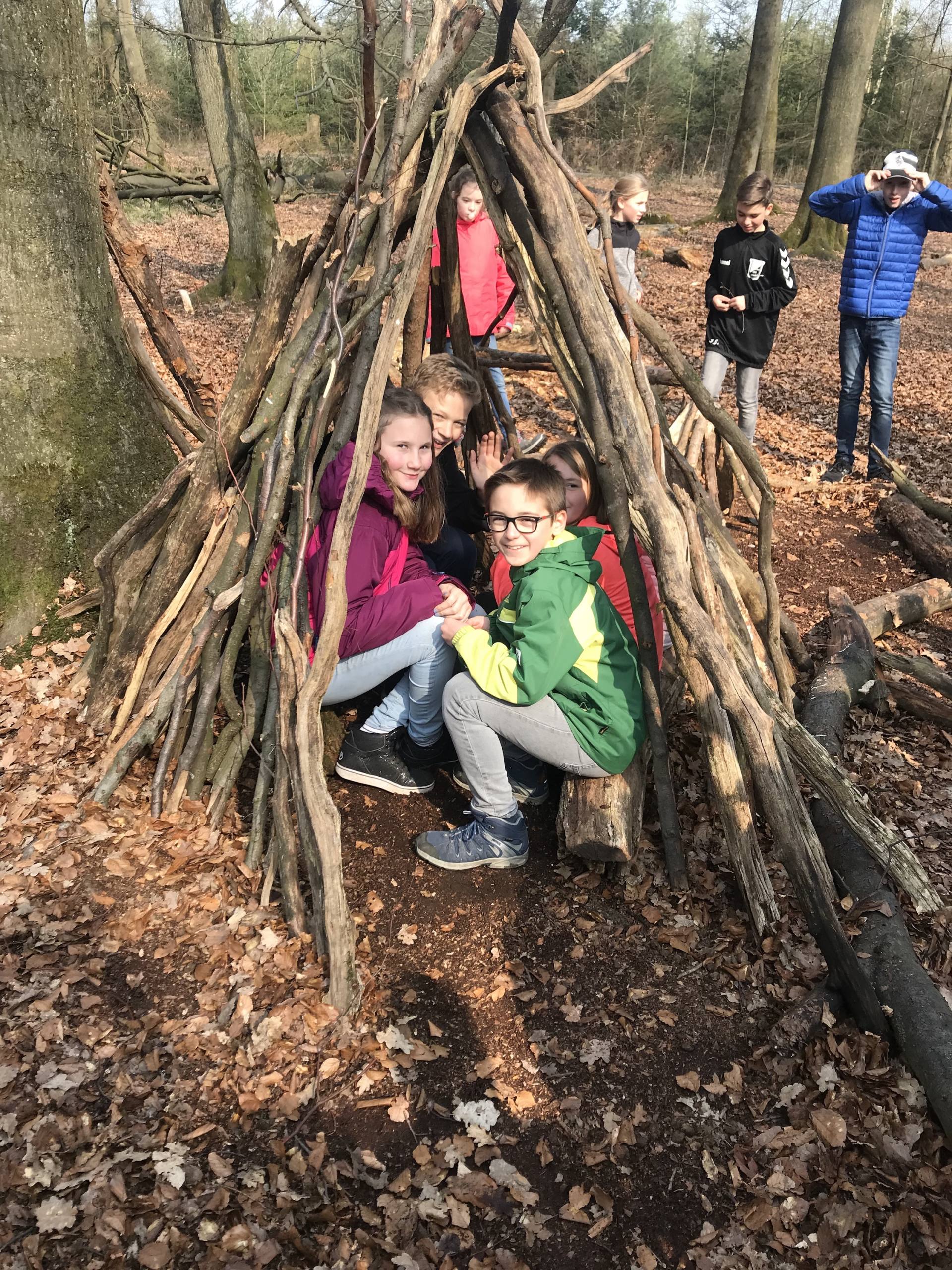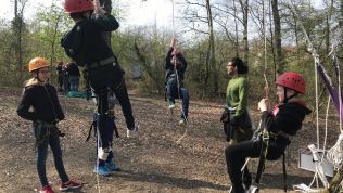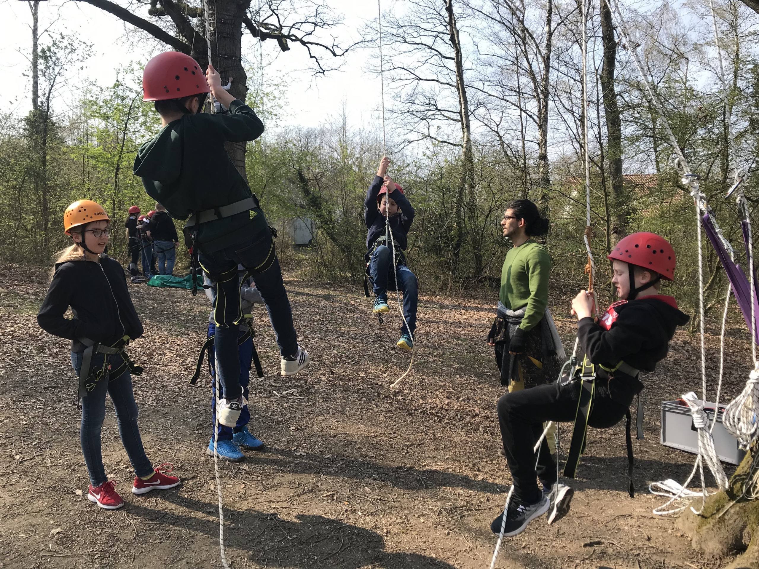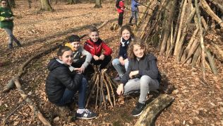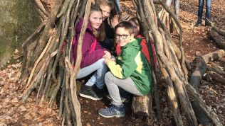 So wurden direkt die Wanderschuhe geschnürt und es wurde gemeinsam der Weg zum Aussichtsturm erklommen. An den nächsten Tagen wurde, unterstützt durch Teamer von „Kräftespiel“, mit erlebnispädagogischen Mitteln an der Kooperation innerhalb der Klassen gearbeitet, indem die Schülerinnen und Schüler zum Beispiel Tipis bauten, beim Klettern über sich hinauswuchsen und riesengroße Murmelbahnen gemeinschaftlich mitten im Wald anlegten.