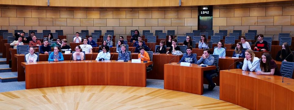 Um eine politische Debatte genauer nachzuempfinden, hatten wir kurze Reden von maximal drei Minuten vorbereitet. Diese bezogen sich auf den fiktiven Gesetzesvorschlag, der das Wahlrecht ab Geburt einführen soll. Der Landtagspräsident eröffnete die Sitzung und aus jeder Fraktion durfte ein Abgeordneter die vorbereitete Rede halten. Als Abgeordnete der FDP trug ich meine Rede an dritter Stelle vor. Es war eine interessante Erfahrung, vor so einer großen Gruppe, aber besonders in so einer Umgebung mit Rednerpult, Mikrophon usw. ein kurzes Statement mit meiner Argumentation abzugeben. Wir hörten verschiedene Meinungen zu diesem Thema und sehr gute Untermauerungen dieser durch schlüssige Argumente und anschauliche Beispiele.
