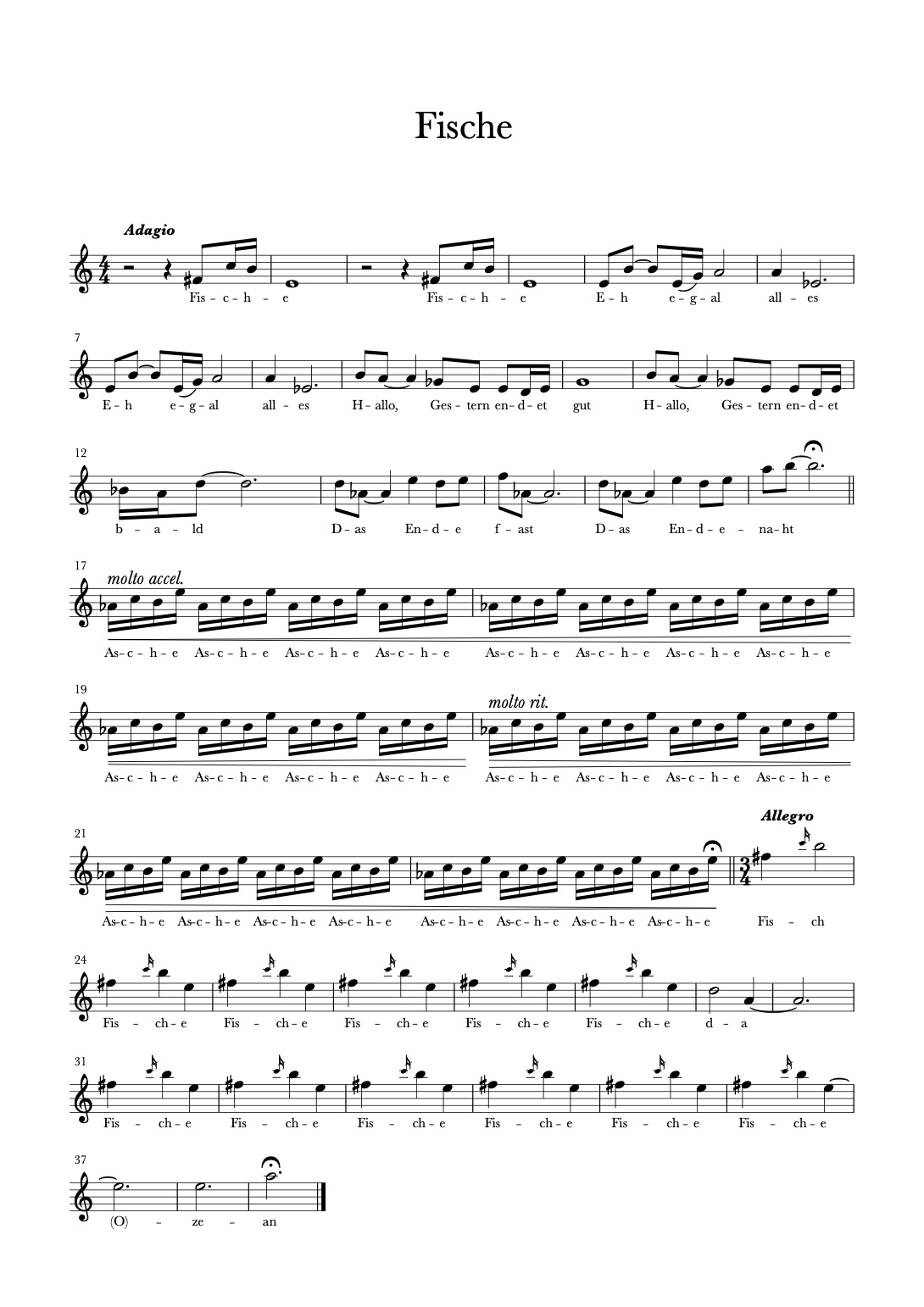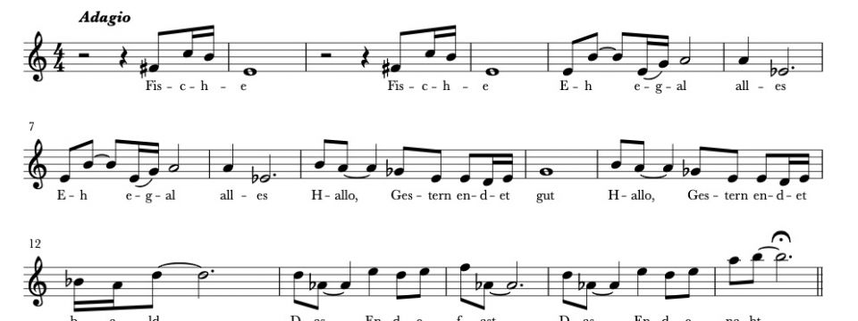 Jede musikalische Note hat einen Namen wie C, E, Fis, As usw. Aus den Buchstaben von deutschen Wörtern lassen sich diese Noten herauslesen. “Bald” wird also beispielsweise zu B, A und D, “Asche” zu As, C, H und E. Buchstaben wie L oder K, die für keine Note stehen, werden ausgelassen. Mithilfe dieser Technik habe ich auf der einen Seite ein symbolistisches Gedicht geschrieben. Auf der anderen Seite steht ein Stück, das die Eindrücke des Gedichts musikalisch reflektiert und die Geschichte klanglich neuerzählt. Diese Bilingualität musste natürlich noch leicht verständlich aufs Papier gebracht werden. Dazu habe ich die Melodie des Stückes notiert und die Worte, aus denen die Musik entstand, als “stummen Liedtext” darunter geschrieben.
