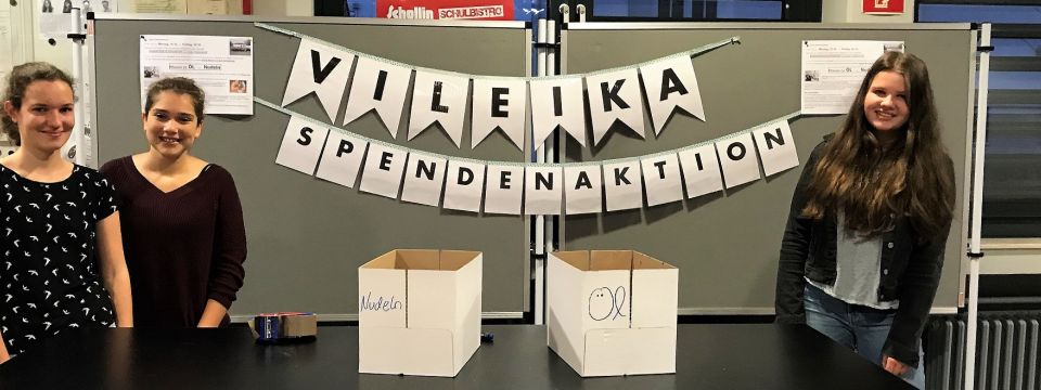 Bei der Aktion wurden neben Geldspenden 55 Familienpakete, 142 kg Nudeln und 108 Liter Öl zusammengetragen. „Das ist ein toller Erfolg und immer wieder erfreulich, wie großzügig die Spendenbereitschaft unserer Schulgemeinschaft ist“, sagt Stephanie Tenbusch nach der Aktion. Stephanie Tenbusch übernimmt gemeinsam mit Maria Vollendorf-Löcher und Christina Evers die Betreuung der Vileika Spendenwoche, nachdem Wolfram Syben uns letztes Schuljahr verlassen hat. Er betreute die Aktion in den letzten Jahren und ist sehr dankbar, dass diese fortgesetzt wird. Ein großes Dankeschön gilt auch den Klassen 9b, 9c und 9e, die den Stand in der Pausenhalle betreuten und die Spenden entgegennahmen und verpackten.