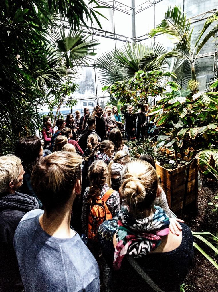 Nun begann die Führung. Zuerst bekam jeder ein Stück Schokolade. Dann fragte uns der Führer was wir alles schon über Schokolade wissen. Das war eine ganze Menge. Wir redeten über die Arbeitsbedingungen der Kakaobauern. Dann haben wir ein Bild von einem Kakaobaum gesehen. Der Baum war sehr groß. Dann gingen wir in eine Art Gewächshaus. Dort standen zwei echte Kakaobäume. Sie waren nicht groß. Weil in der Art Gewächshaus die Sonne so hell scheint, waren die Kakaobäume etwas vertrocknet. Danach wurde uns der Handelsweg des Kakaos erklärt. Nun sind wir zu einem Tisch gegangen, wo man die Zutaten zu einer Tafel Schokolade gesehen hat.