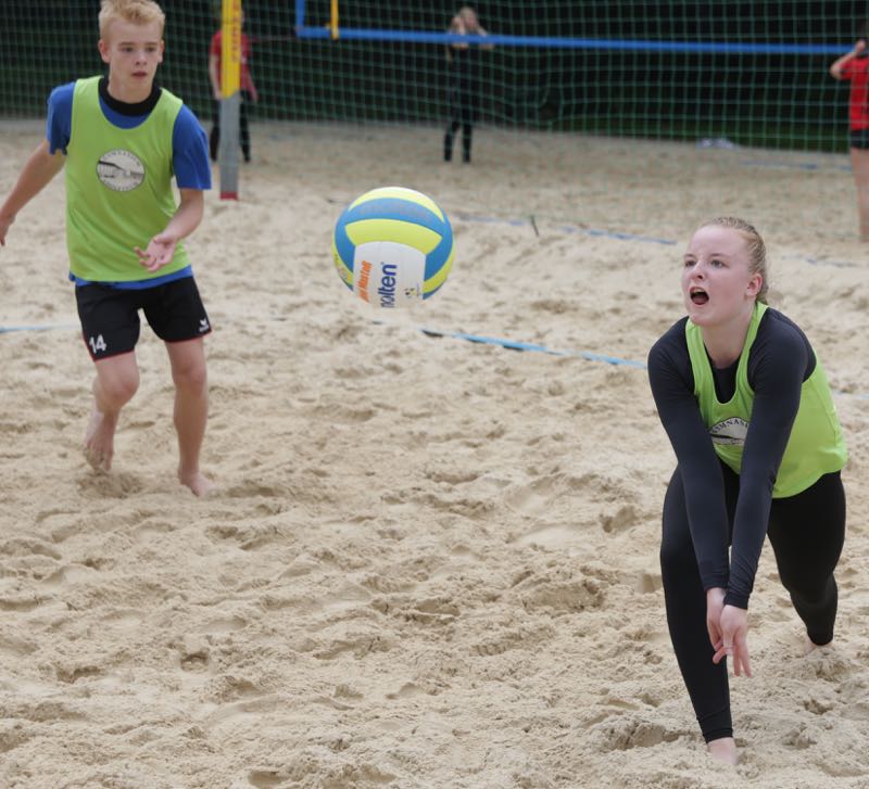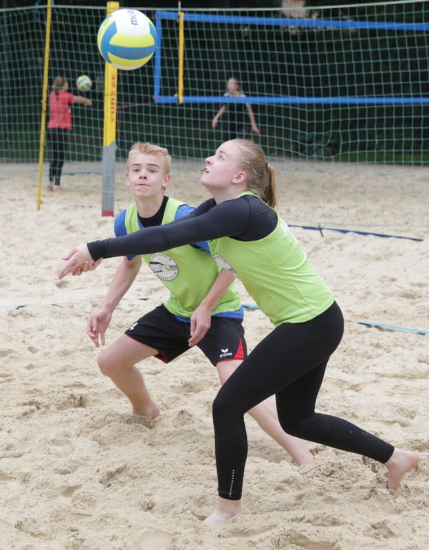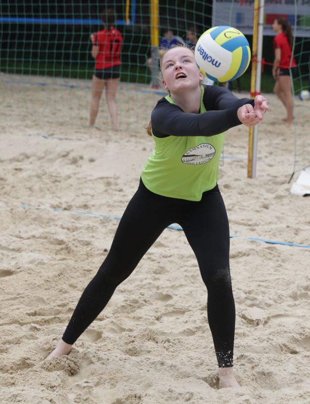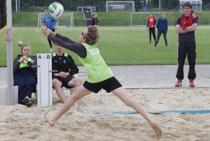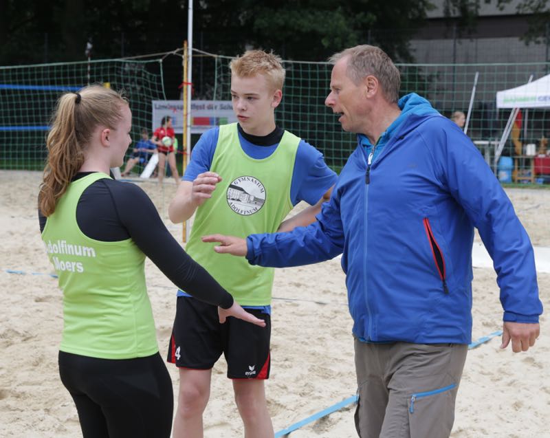 Lediglich Wiebke Bils blieb von der erfolgreichen Mannschaft der vergangenen Jahre „übrig“, ansonsten nur „Newcomer“. Zum einen vier Jungen (Veit Bils, Jan Schliekmann, Moritz Liebisch und Clemens Spoo) aus dem erfolgreichen Adolfinum-Team, das beim Bundesfinale im Hallenvolleyball in der Wettkampfklasse III den sechsten Platz in Berlin erreicht hatte, zum anderen drei weitere junge „Damen“: Melisa Uluisik, Kendra Weyers und Amelie Löhndorf. Allen gemeinsam: Sie befinden sich am unteren Ende der spielberechtigten Jahrgänge und sind im Schnitt zwei bis drei Jahre jünger als ihre Kontrahenten. Im Vorfeld wurde dann auch ein zweites Handicap deutlich: Es gibt in Moers nur wenig Trainingsmöglichkeiten - die bisher genutzten Beachfelder fielen aufgrund der Umbaumaßnahmen im Solimare und fehlender Nutzungsgenehmigungen aus -, so dass man quasi „unvorbereitet“ antreten musste: Martin Schattenberg: "In den letzten Jahren waren wir meist schon im Vorfeld auf die Teilnahme am Landesfinale abonniert, aber in diesem Jahr galt eher: Schauen wir mal, was so geht...".