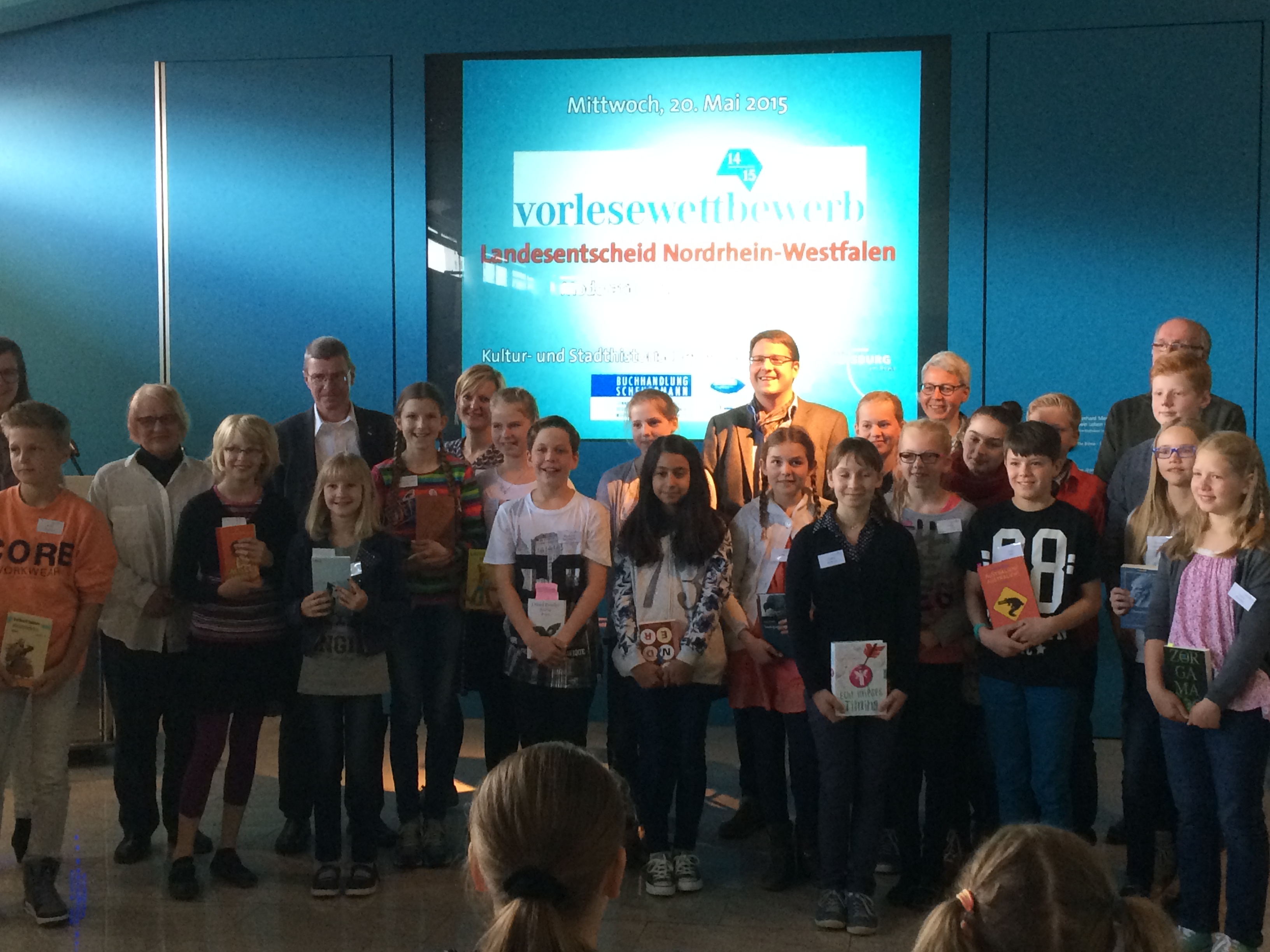 Am Mittwoch, den 20. Mai 2015 fand der NRW Landesentscheid für den Vorlesewettbewerb statt. Für das Adolfinum trat Timo Otto aus der Klasse 6e an, der bereits mehrere Vorrunden sehr erfolgreich hinter sich gebracht hatte. Um 11.30 Uhr begrüßte Kabarettist Kai Magnus Sting im Kultur- und Stadthistorischen Museum der Stadt Duisburg die 16 aufgeregten Kreissieger und ihre mitgereisten Eltern, Freunde und Lehrer. In der Jury saßen unter anderem Thomas Krützberg, Kulturdezernent der Stadt Duisburg, und Kinderbuchautor Gerd Ruebenstrunk, der Am Adolfinum vor einiger Zeit eine Lesung gehalten hatte.