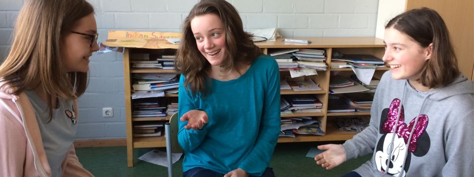 Prüfungsvorbereitung im Gespräch: Celina, Lilia und Leonie (alle 7a) üben für die mündliche Prüfung im Fach Französisch.