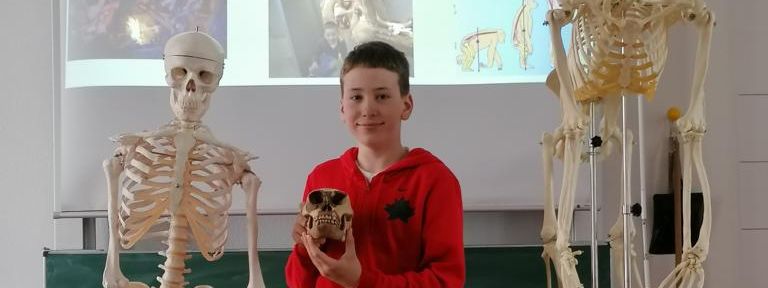 Stellt sich den Ur-Fragen der Menschheit: Magnus Kindermann, aus der Klasse 6c, klärt über die Entstehung des homo sapiens auf.