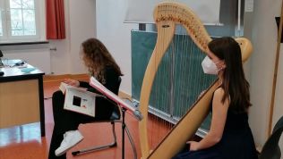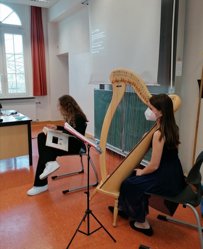 Pauline van der Holt und Annika Hauschild (6e) präsentierten ein schönes selbst geschriebenes Märchen mit eigener Harfen-Untermalung. Auch physikalische Themen wie Neutronensterne und Brückenbau waren vertreten und die Zuschauenden wurden in die Kaiserzeit und in das Moers zur Zeit der Preußen mitgenommen.