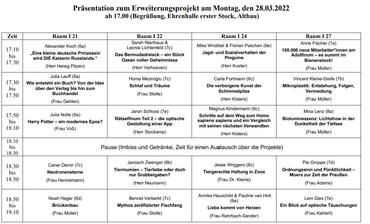 Am Montag, 28. März 2022 fand im Gymnasium Adolfinum die Präsentation der Ergebnisse des diesjährigen Erweiterungsprojektes statt. Im Rahmen des Projekts bekommen begabte und interessierte Schülerinnen und Schüler die Möglichkeit, sich über einen längeren Zeitraum – und unabhängig vom Unterricht – mit einem selbst gewählten Thema zu beschäftigen. Die Recherchen und sonstigen Bemühungen münden letztlich in einer Präsentationsveranstaltung, bei der die Ergebnisse zu teilweise ungewohnten Fragestellungen vorgestellt werden. So beschäftigten sich die Schülerinnen und Schüler in diesem Jahr zum Beispiel mit Neutronensternen, Biolumineszenz oder dem Bermudadreieck. Carla Fortmann (11 Jahre) forschte interdisziplinär zu Schimmelpilzen und fand auch in eigenen Experimenten heraus, dass diese Lebewesen mit eher schlechtem Ruf auch eine ästhetische Seite haben und sogar nützlich sein können. Annika Hauschild und Pauline van Holt (6. Klasse) schrieben eine „Liebesgeschichte“, die sie musikalisch mit selbst komponierten Harfenklängen umsetzten. Der Siebtklässler Jaron Schloss programmierte an einer App für das Smartphone.