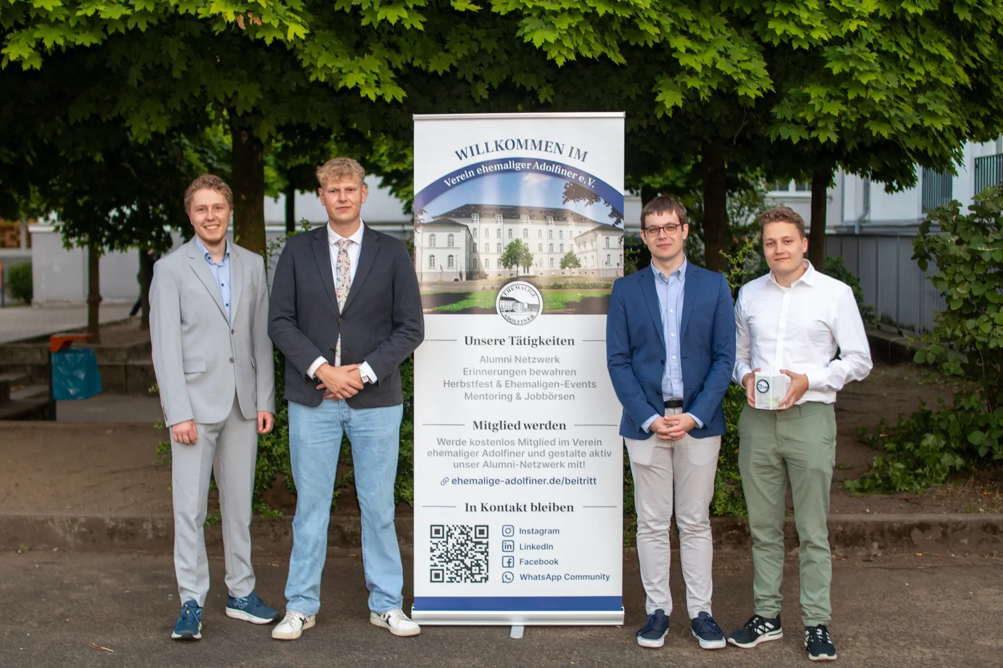 Am 27. Juni 2025 hat sich der Vorstand des Ehemaligenvereins bei der Verleihung der Abiturzeugnisse erstmals öffentlich präsentiert – mit einer Rede und einem Informationsstand. Die Vorsitzenden Lennart Fischer und Simon Krenz stellten dabei die neue Internetseite des Vereins vor. Über diese ist nun auch der kostenlose Beitritt online möglich. Bestehende Mitglieder werden gebeten, ihre aktuelle E-Mail-Adresse an verein@ehemalige-adolfiner.de zu senden, um die weitere Digitalisierung des Vereins zu unterstützen.