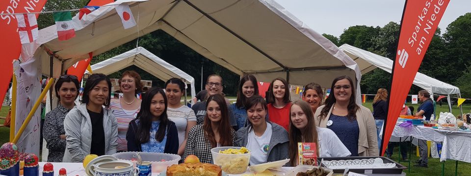 "Vielfalt schmeckt" - Unter diesem Motto hatten sich unter der Leitung von Karin Wendt, der Rektorin der Gebrüder-Grimm-Grundschule, und Rüdiger Eichholtz, dem Vorsitzenden des Vereins Kulturprojekte Niederrhein, fast alle Moerser Schulen zusammengeschlossen, um am 06. Juni ein Internationales Picknick im Moerser Schlosspark zu veranstalten. Natürlich war auch das Gymnasium Adolfinum mit vielen Teilnehmenden aus den Deutsch als Zielsprache-Kursen vertreten.