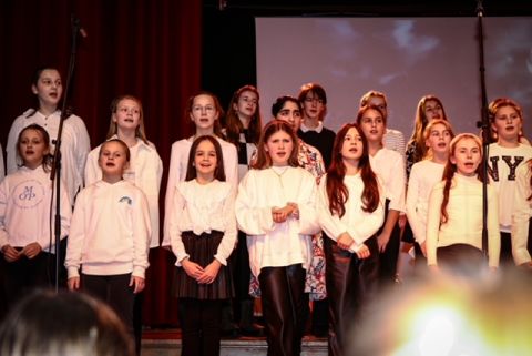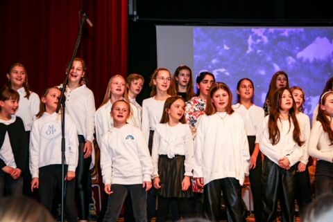 Der Unter- und Mittelstufenchor erfreut das Publikum mit strahlenden Stimmen. -