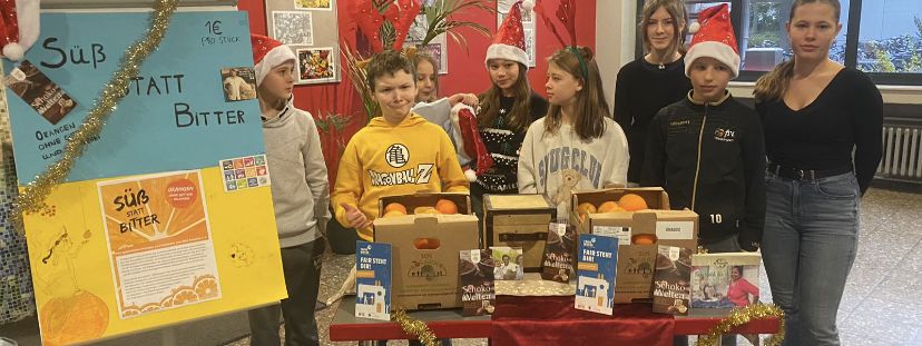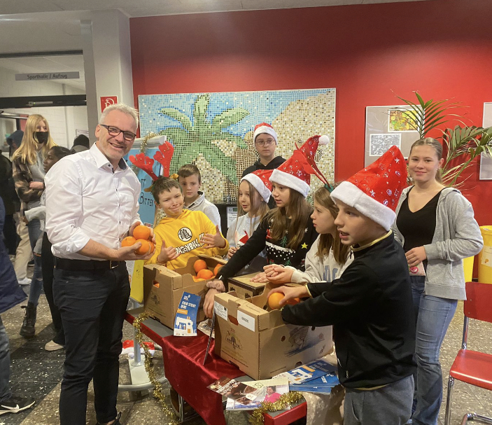 Am letzten Freitag vor den Weihnachtsferien verkaufte die AG-FitForGerman(y) fair produzierte, gehandelte und biologisch angebaute Orangen aus der Region Rosarno in Italien.