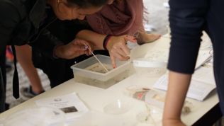 Dass Boden kein Dreck ist, sondern eine wichtige Lebensgrundlage bietet, verdeutlichten Ernst Kisters und Erdkundelehrerin Stephanie Tenbusch. So wurden die Bodenhorizonte mithilfe von Erdbohrern ermittelt, der Kalk- oder Humusgehalt des Bodens bestimmt und kleinste Bodenorganismen identifiziert.