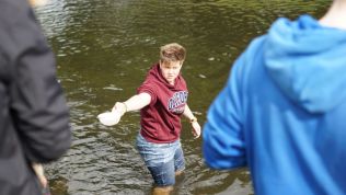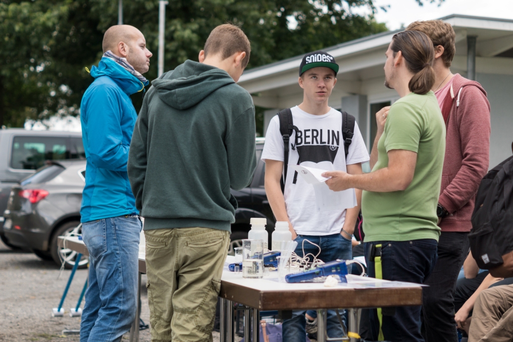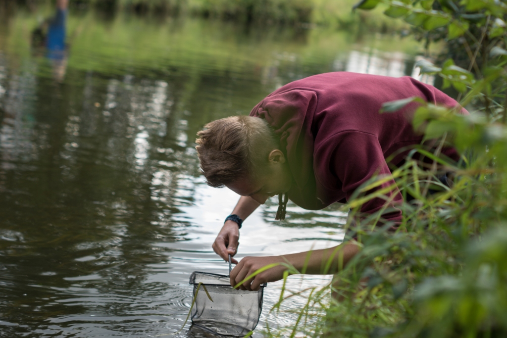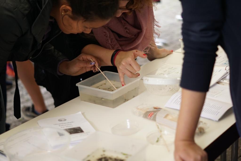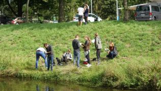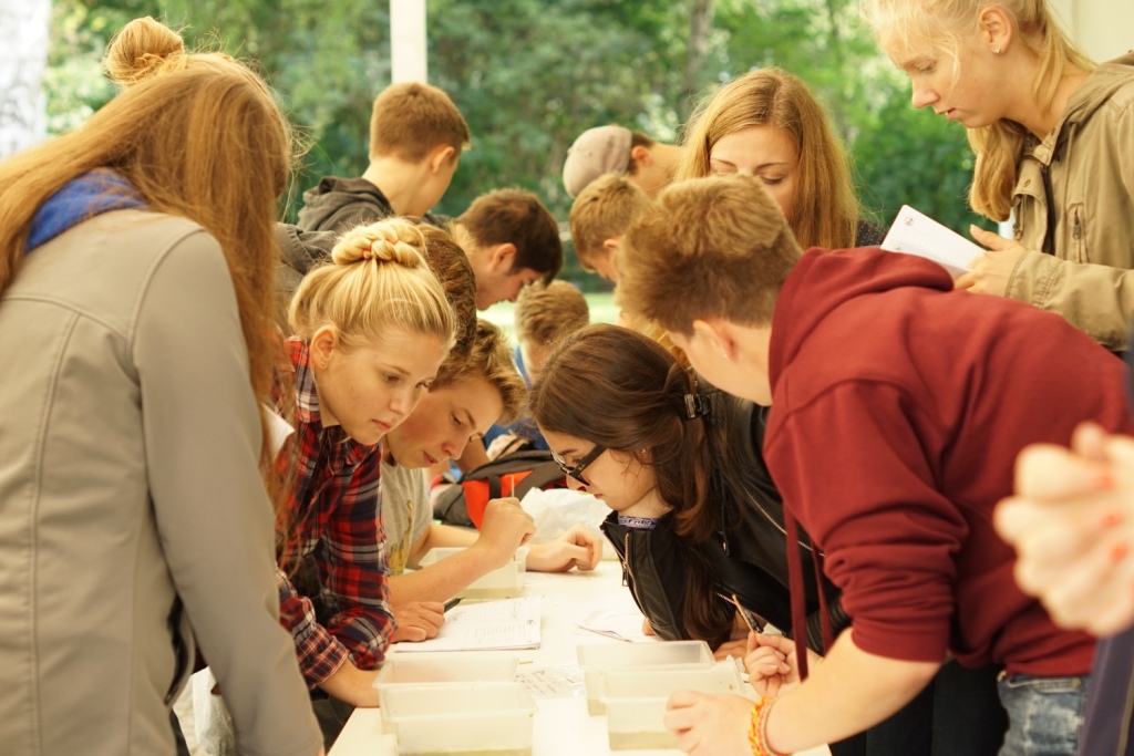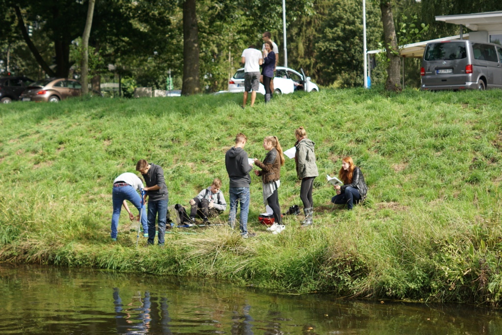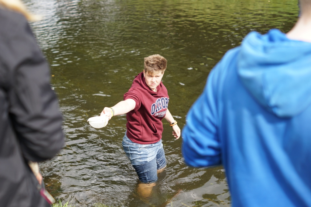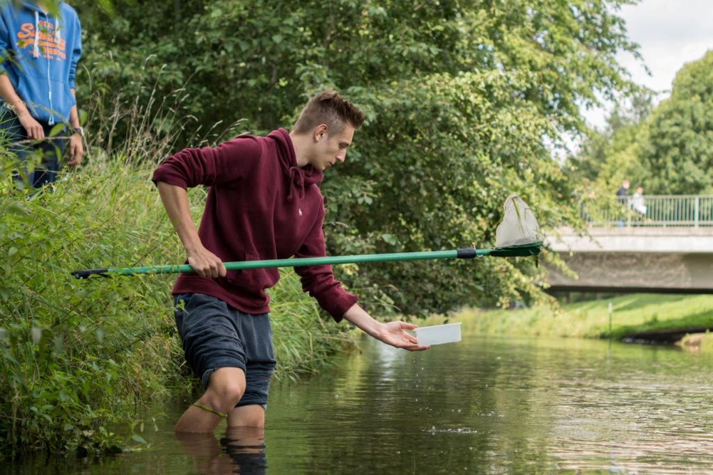 In Willich-Neersen erwarteten die Nachwuchsforscher vier Stationen mit einer Vielzahl an spannenden Experimenten. Auf die Suche nach kleinsten Lebewesen in der Niers, den so genannten Indikatororganismen, ging es an der biologischen Station. Diese Organismen lassen Rückschlüsse auf die gute Wasserqualität der Niers zu, sind aber nicht immer leicht zu finden. Und so musste manch Flussforscher doch tief in das Wasser hinein, um einen guten „Fang“ zu machen. Bei der Auswertung half das Biologie-Team des Adolfinums, das durch Carolin Andree ergänzt wurde.