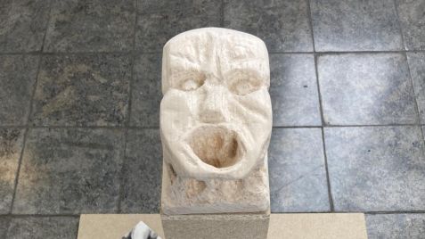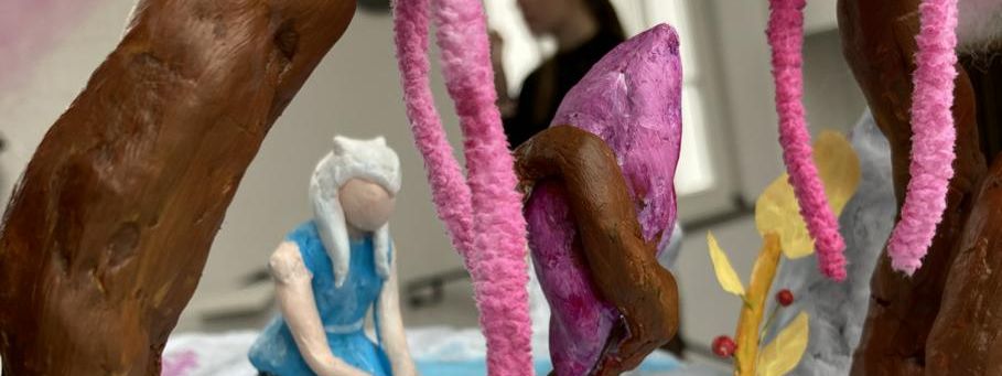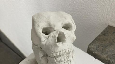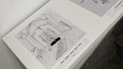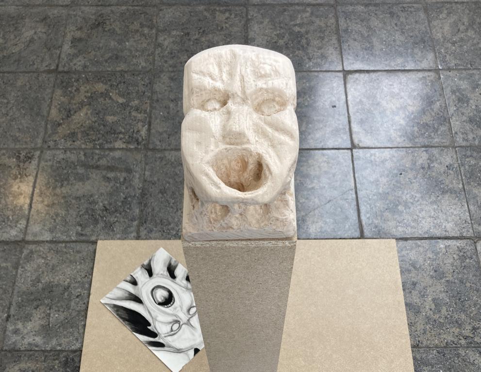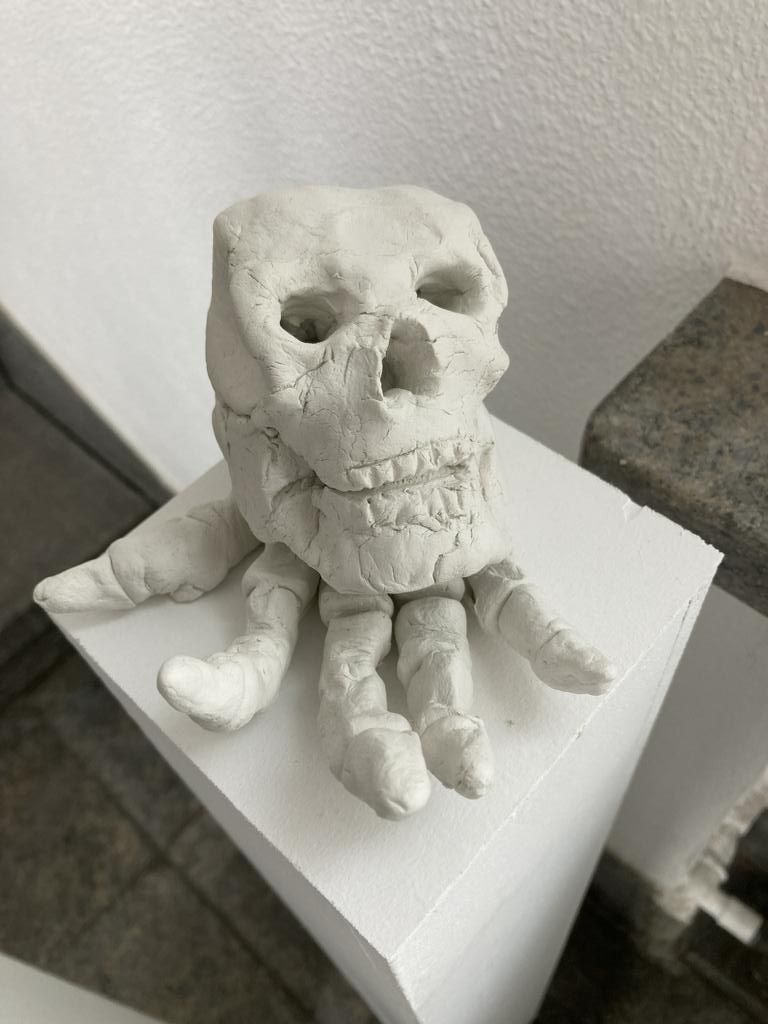 Nebenan steht eine modellierte Landschaft von Alissia Gillhaus. Aus einem Gewässer heben Hände eine Insel empor. Zuckerwattewölkchen muten paradiesisch an – doch die Insel kippt. Gegenüber schauen uns die sonderbaren Wesen von Ben Schönwälder an, Spinnengesichter und zärtliche Totenhände. Jule Spaltmann präsentiert einen in harter Arbeit aus Lindenholz geschnitzten Kopf und Zeichnungen, die von psychischen Erkrankungen und Belastungssituationen erzählen.
