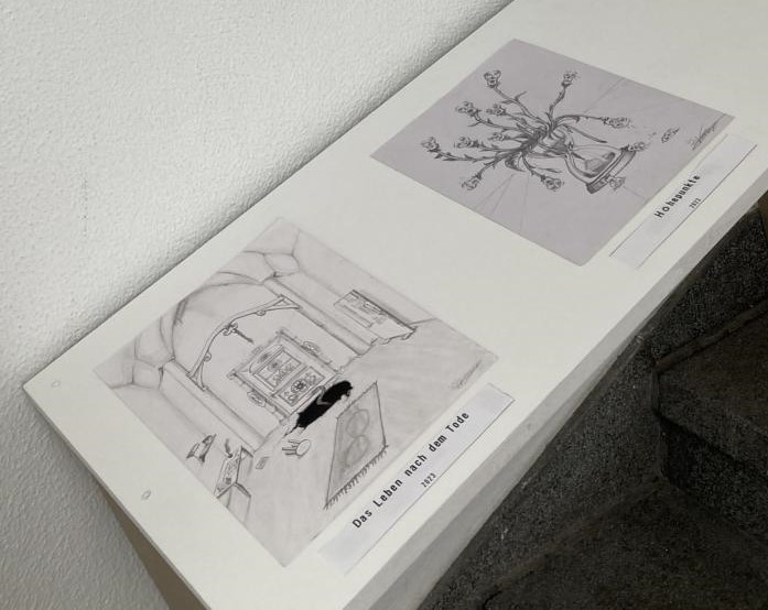 In der Treppenhausgalerie des Altbaus präsentiert David Valk seine Zeichnungen auf einem schief stehenden Tisch, der quer über die Treppen gestellt ist, sodass wir sie nur in unsicherem Stand betrachten können. Was wir dort sehen sind schwarze Löcher und eigenartige Gesichter in Blumenvasensanduhren.