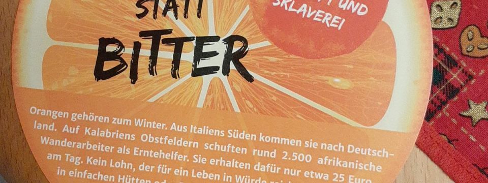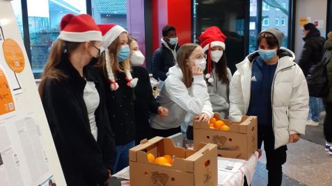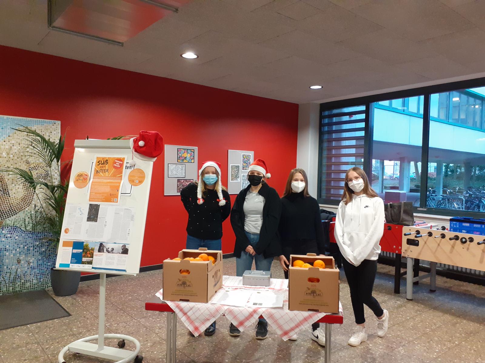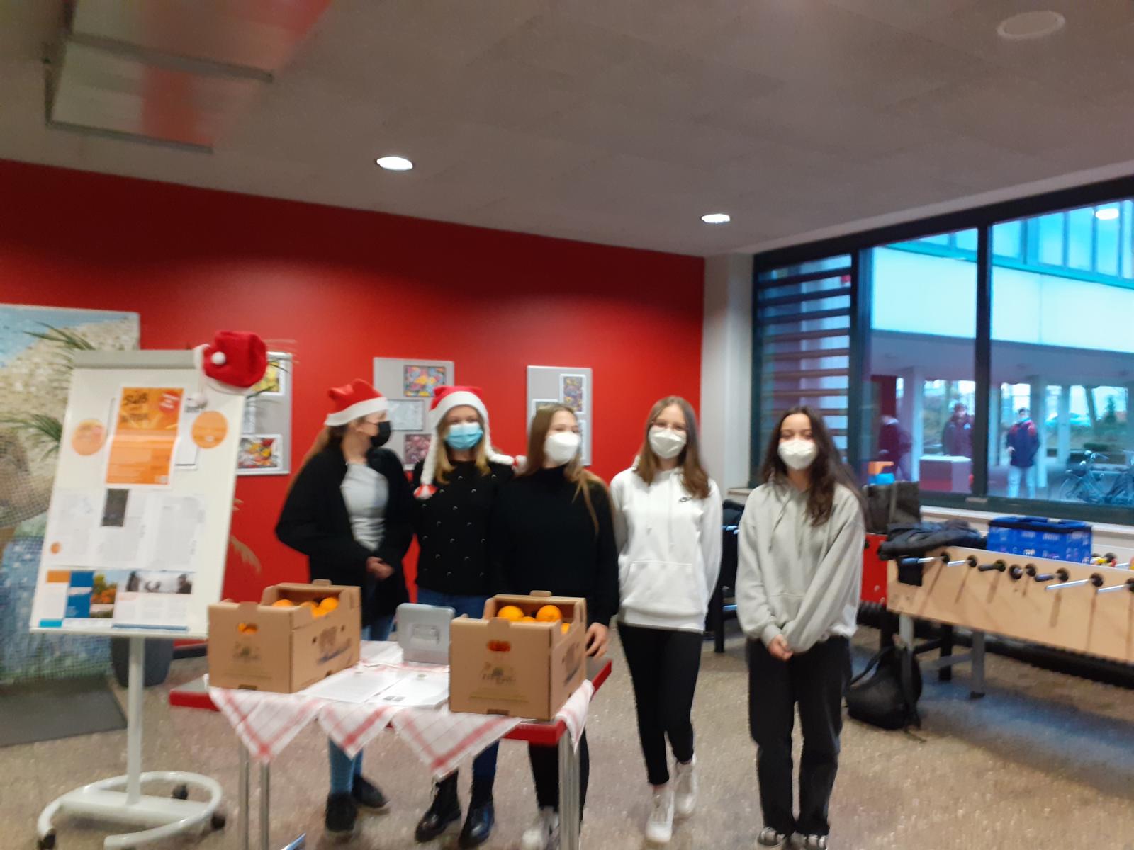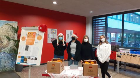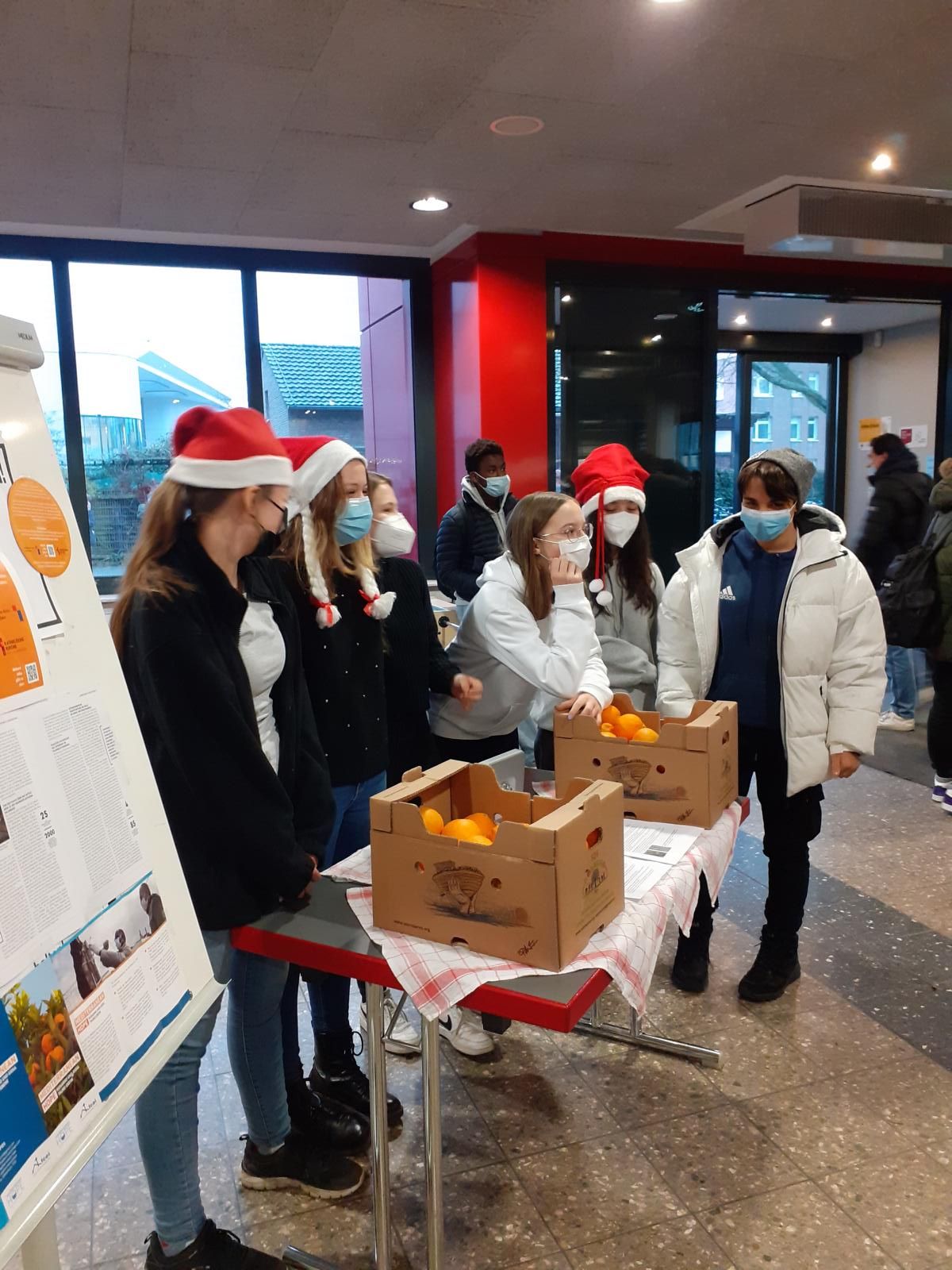 Am Freitag, den 17. Dezember 2021, verkaufte die AG Fit For Future in der ersten großen Pause fair produzierte, gehandelte und biologisch angebaute Orangen aus der Region Rosarno in Italien. Wir wollten damit auf die unglaublich schlechten Bedingungen hinweisen, unter denen normalerweise unsere weihnachtlichen Orangen von illegalen Migranten geerntet werden.