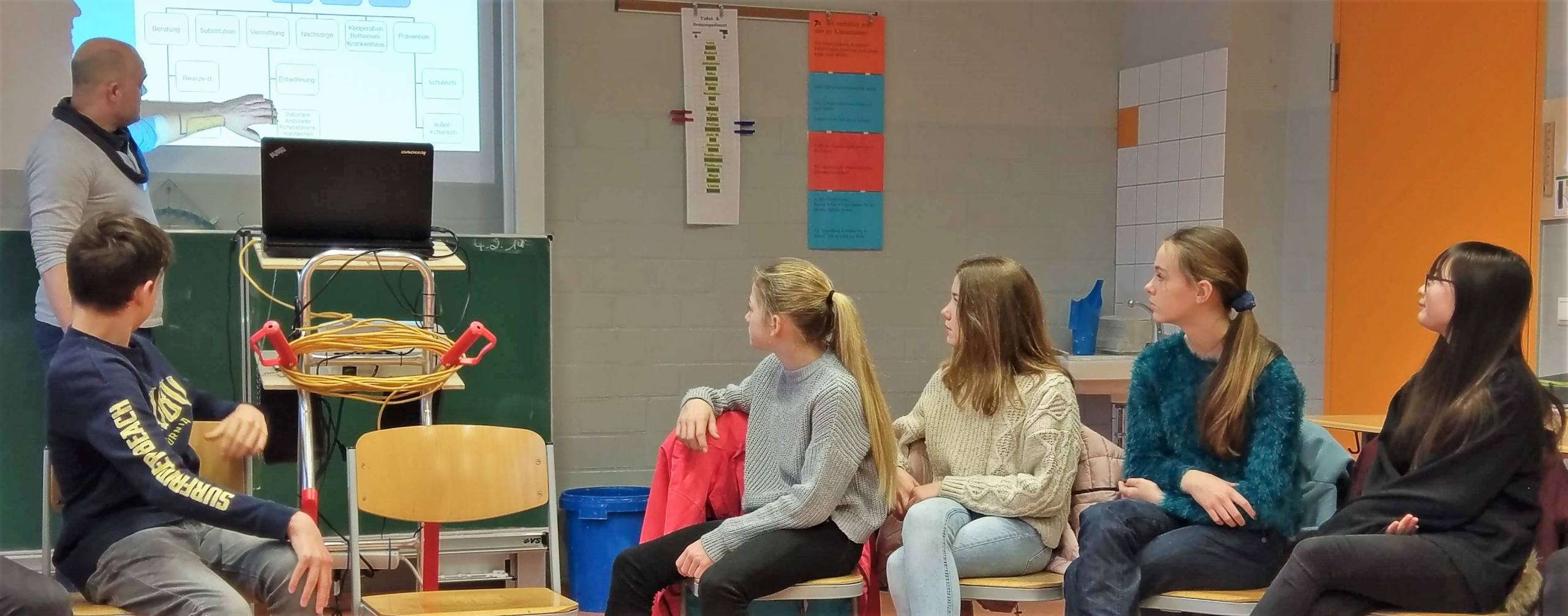 Herr Olders stellte zunächst die Drogenberatung Moers und ihre Angebote vor, so erfuhren die Schülerinnen und Schüler, dass die Diakonie für Abhängige aller illegalen Drogen Beratung jeden Alters und für Abhängige legaler Drogen bis zum 26. Lebensjahr anbietet. Auf die Frage, wie er zu seinem Beruf gekommen sei, antwortete Christoph Olders, dass er nach einer Schreiner-Ausbildung ein Studium der Sozialwissenschaften abschloss und als langjähriger Pfadfinder seine Ader anderen zu helfen schließlich in seinen Beruf umsetzen wollte.