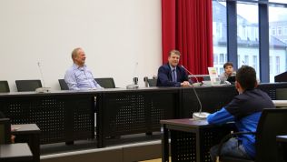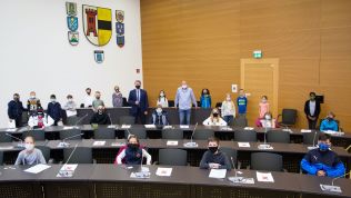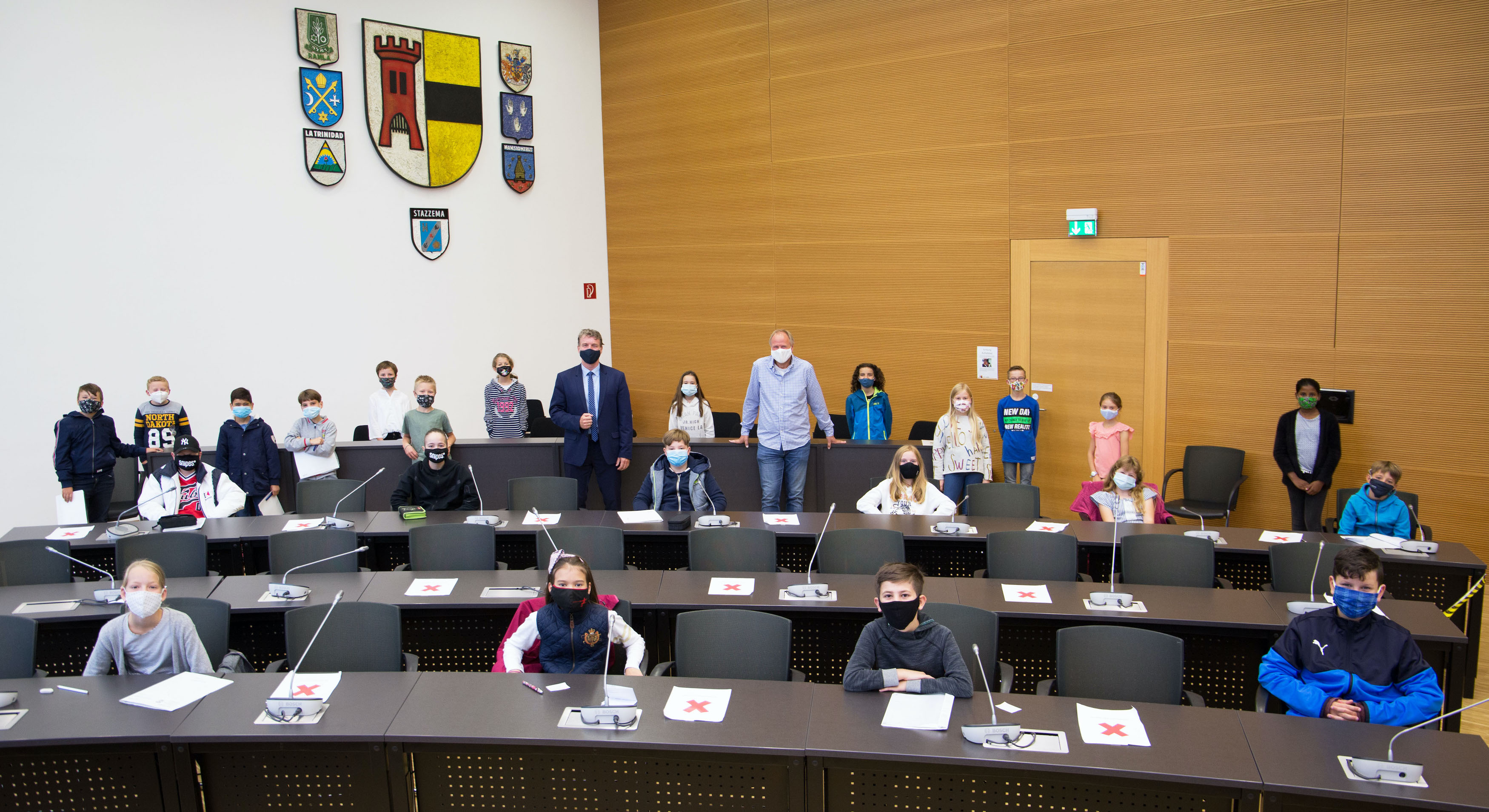 Die äußere Situation war unter Corona-Bedingungen wie in der Schule: Auf dem Weg im Rathaus zum Ratssaal mit Maske, auf den Plätzen mit ensprechendem Abstand konnten die Fragen dann über das Mikro wie in einer richtigen Ratssitzung ohne Maske gestellt werden. Als frisch gewählter Klassensprecher durfte Tiago Esteves-Gotthelf auch Platz auf dem Podium neben Herrn Fleischhauer und Herrn Schattenberg nehmen.