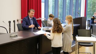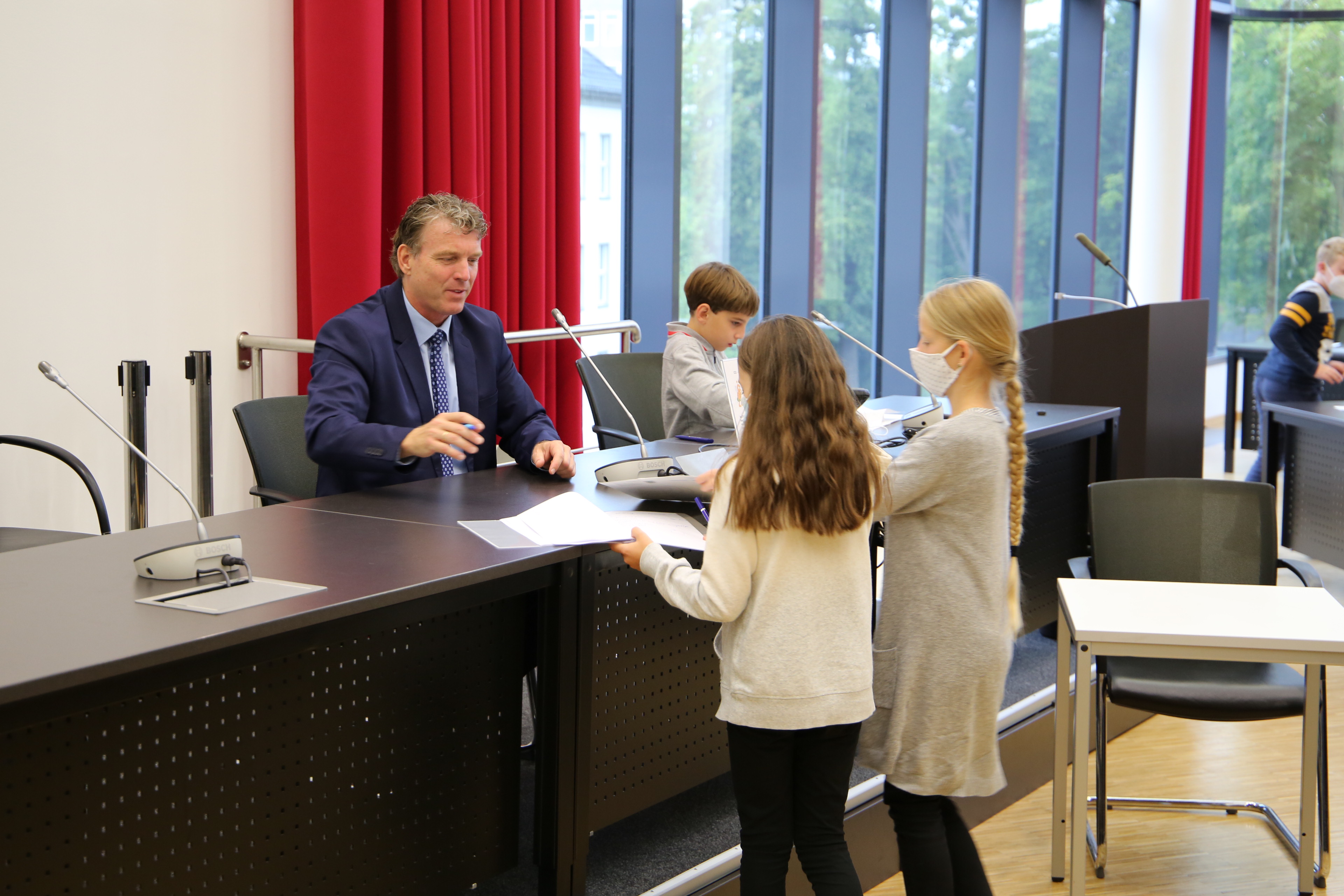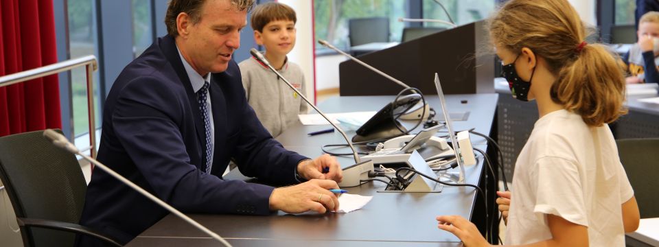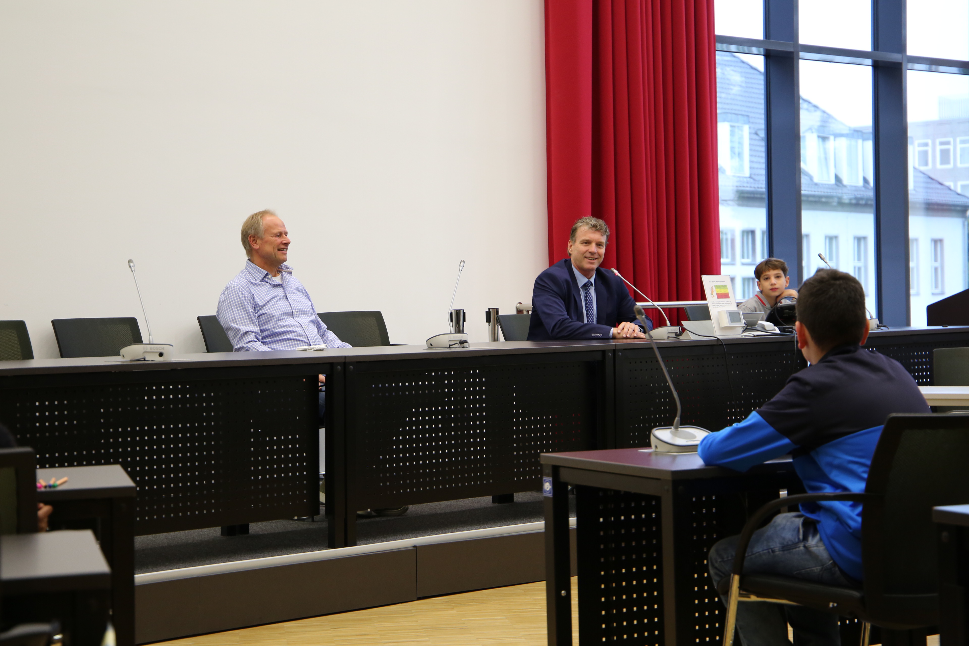 Die Klasse 5b im Moerser Rathaus: Ella und Tiago mit Christoph Fleischhauer.