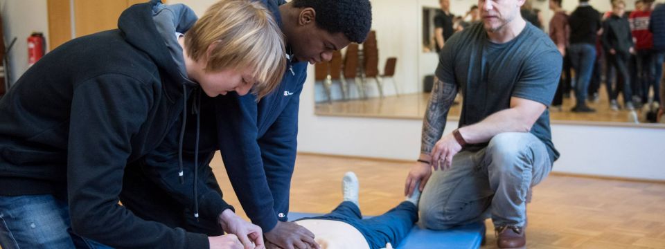 Lebensrettende Maßnahmen in Theorie und Praxis: die Neuntklässler in Theorie und Praxis die lebensrettenden Maßnahmen, die beim Herzkreislauf-Stillstand einer Person nötig sind.