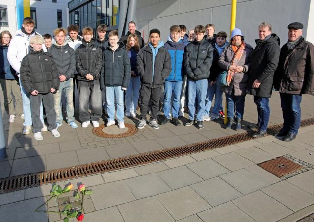 Schülerinnen und Schüler der Klassenstufe 9 nahmen zusammen mit Bürgermeister Christoph Fleischhauer und Mitgliedern der Gesellschaft für Christlich-Jüdische Zusammenarbeit Moers an der stadtweiten Aktion teil.
