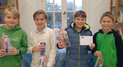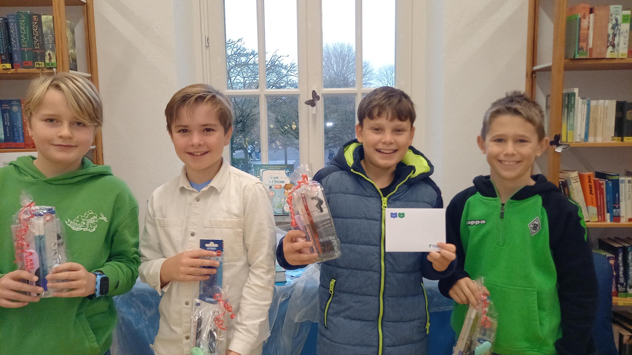 Mit Präsenten prämiert: Der stolze Jahrgangsstufensieger Matteo Kaiser (2. v.r.) im Kreise der Zweitplatzierten Hannes Nühlen (ganz links), Yanis Stais (2. v.l.) und Lasse Kerschen (ganz rechts).