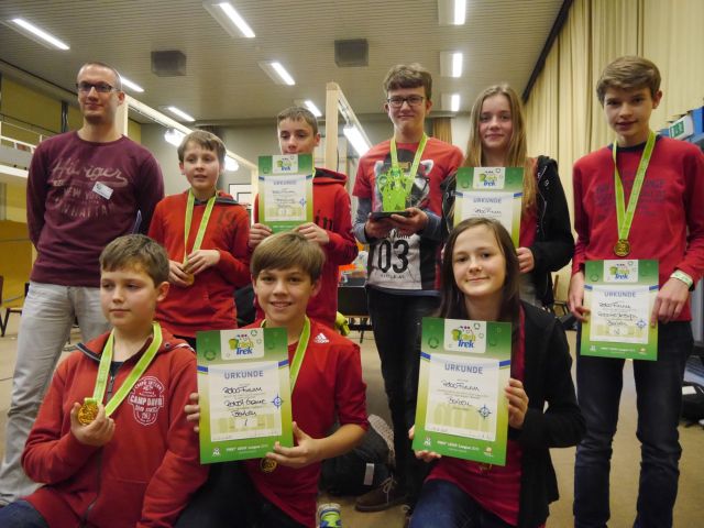 Das siegreiche Team RoboFinum (von links nach rechts und von vorne nach hinten): Simon Stavroulakis, Lars Hogardt, Pia Kleinwegen; Tim Herrmann, Matthias Karl, Cedric Damerow, Lukas Corell, Katharina Schmitz, Moritz Weihnacht.