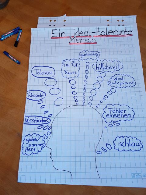 Die zweite Gruppe erstellte in der gleichen Zeit Plakate zum Thema „Toleranz“. Die Plakate sollten in noch kleineren Gruppen bearbeitet werden und die Merkmale einer „ideal-toleranten Person“ enthalten, wobei unserer eigenen Kreativität und Meinung freien Lauf gelassen werden sollte. Danach wurden die Plakate vorgestellt und diskutiert. Im Anschluss saßen wir in einem Sitzkreis und bekamen Kärtchen, auf denen für uns wichtige Wörter bzw. Werte standen. Mit einem Partner sollten wir dann darüber diskutieren, welche wir als am wichtigsten ansehen. Dann besprachen wir, die wir als Gruppe als besonders wichtig einstufen.