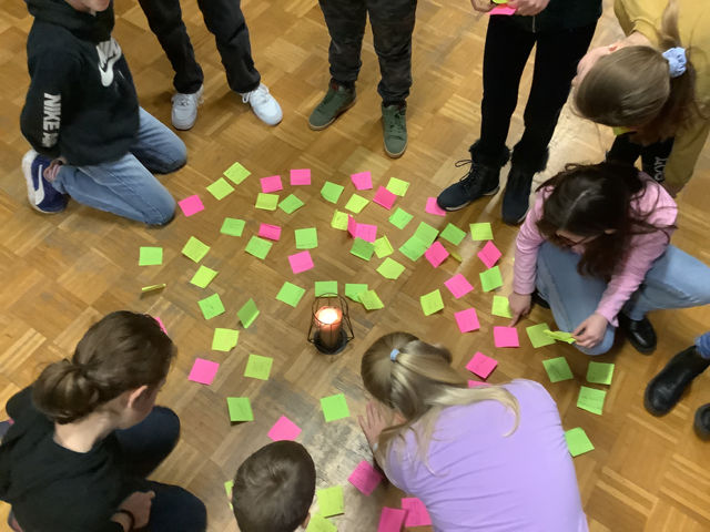 Anschließend wurden wir eingeladen, unsere persönlichen Wünsche und Ziele für 2025 auf bunten Klebezetteln festzuhalten. Diese Zettel klebten wir auf den Boden, lasen sie vor und nutzen diesen Basar der Ziele und Wünsche, um uns inspirieren zu lassen. Es war beeindruckend, wie vielfältig und inspirierend die Beiträge waren – von persönlichen Vorsätzen bis hin zu großen Visionen für die Welt.