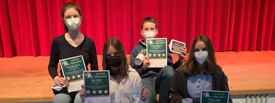 Magnus, Lilien, Emily und Marlene haben ihre Beobachtungen dazu besonders gewissenhaft notiert und ausgewertet, so Dr. Evelyn Kleine, die den Wettbewerb am Adolfinum betreut: "Ihre Arbeiten sind sehr übersichtlich gestaltet und die Texte sind dabei gut formuliert und durch Skizzen und Fotos oder ähnliches ergänzt, so dass sie zu den Besten ihrerJahrgangsstufe in NRW gehören und mit vier Sternen ausgezeichnet wurden, sie sind also wahre Chem-pions!"