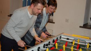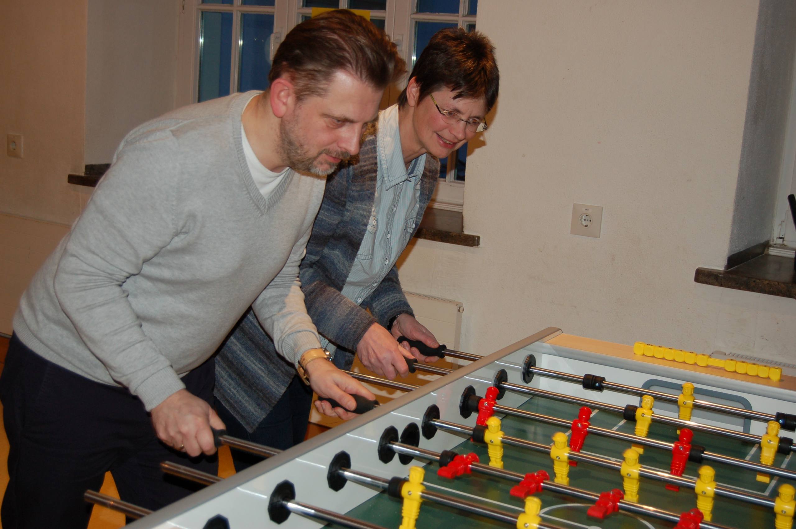 Bei der offiziellen Übergabe wurde auch von der Schulleitung eifrig ausprobiert und um Tore gekickt. Das Team Klein/Maas setzte sich knapp gegen das Team Albus/van Stephoudt durch. Fleißig angefeuert durch die Fans des Fördervereins: Dana Minhorst, Dr. Heinrich Schönemann und Detlef Dawel. Beide Kicker sind in den Pausen für alle Schüler frei und das Motto lautet „Wer zuerst kommt…“.