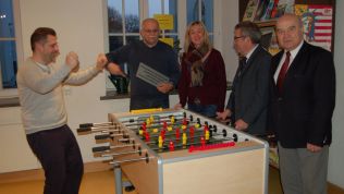 Michaela Albus, Sascha Maas, Detlef Dawel, Dana Minhorst, Hans van Stephoudt und Dr. Heinrich Schönemann bei der Tischkicker-Übergabe.