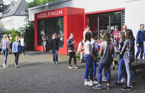 - das sich gesellschaftlich engagiert: Durch das Auschwitzprojekt hat das Adolfinum in hohem Maße an Profil gewonnen und wurde mehrfach dafür ausgezeichnet. Darüber hinaus ist das Adolfinum durch die Mithilfe der gesamten Schulgemeinde unter der Schirmherrschaft des Duisburger Künstlers Gerhard Losemann in das Netzwerk „Schule ohne Rassismus - Schule mit Courage“ aufgenommen worden. Und die Adolfiner mischen sich auch darüber hinaus ein: Ab der Mittelstufe bietet das Adolfinum die Projekte „Jugend präsentiert“ und „Jugend debattiert“ an.
