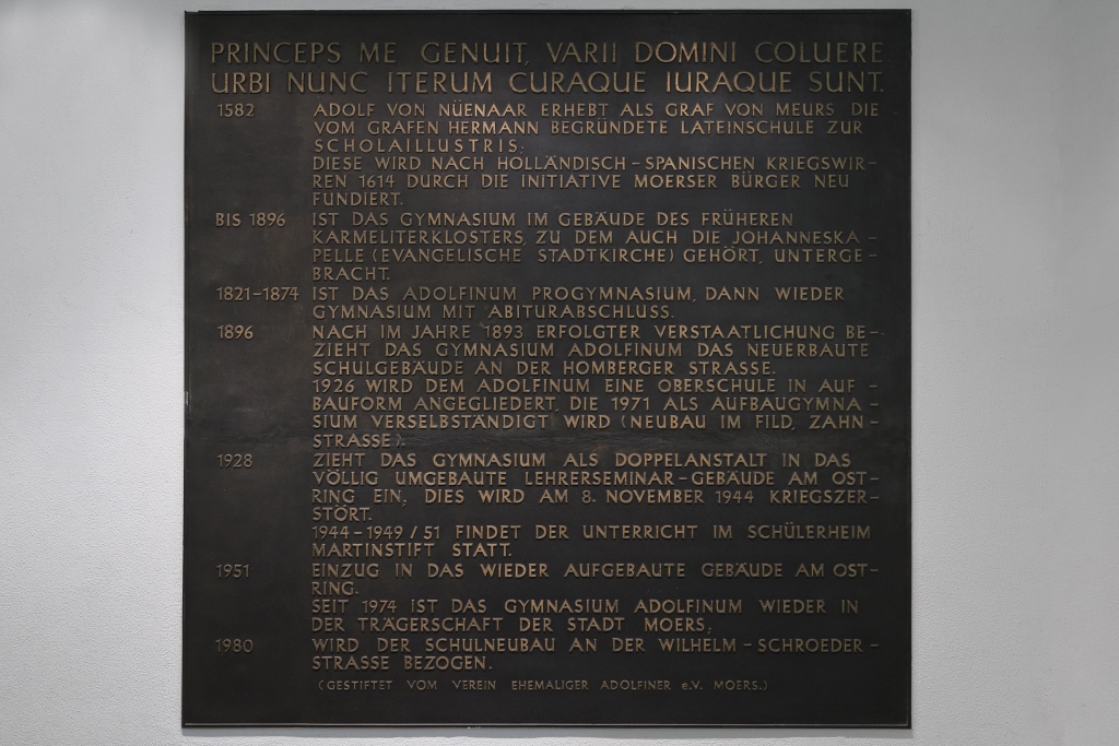Das Adolfinum wurde 1582 durch Graf Adolf zu Neuenahr und Moers gegründet. Als so genannte schola illustris sollte die neue Schule den begabten Jungen der Grafschaft Moers die biblischen Sprachen - Latein, Griechisch und Hebräisch - vermitteln. Alle drei Sprachen gehören bis heute zum Unterrichtsangebot am Adolfinum.