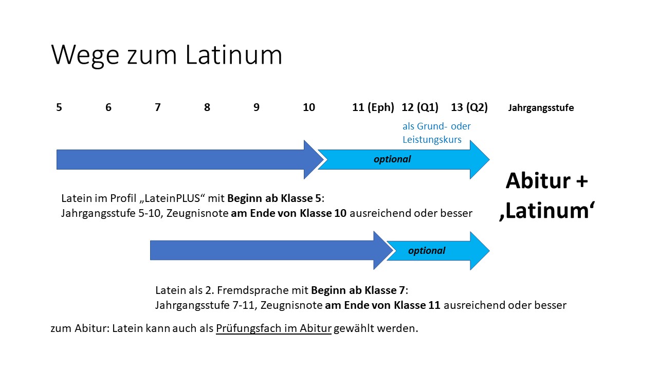 Außerdem besteht (nach aktuellem Stand) für die Schüler und Schülerinnen, die bereits in der Klasse 5 mit Latein beginnen, die Möglichkeit einer Latinumsprüfung am Ende der Klasse 9.